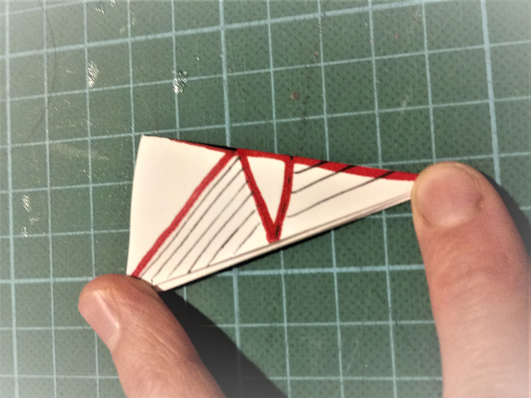 - Nun wird das Dreieck eingeschnitten. Auf einem separaten Modell habe ich dir die Schnitte eingezeichnet (schwarze Linien; siehe Fotos unten)