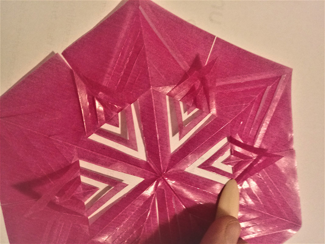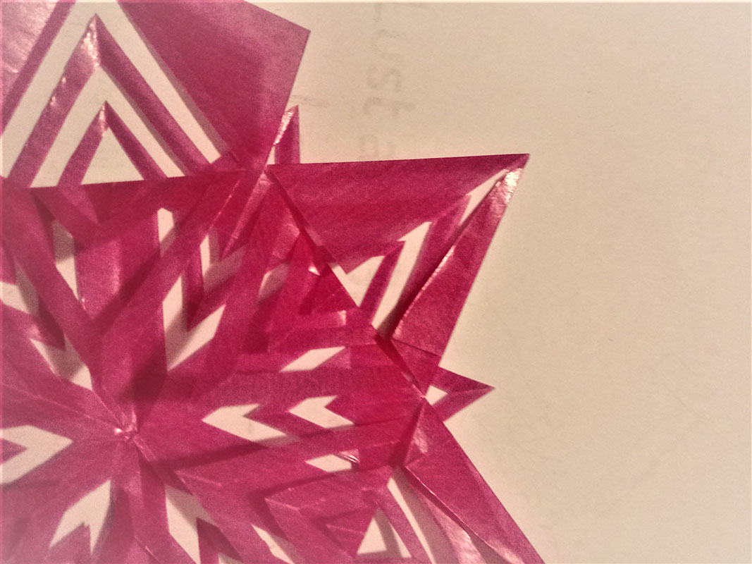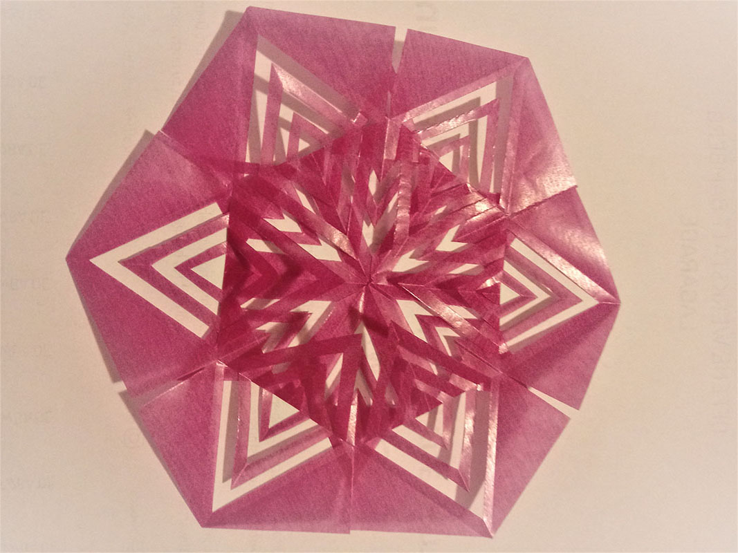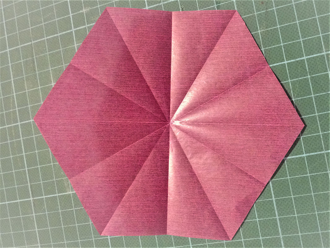 - Wende das Sechseck und bearbeite wie eben den äußeren Teil des Sechsecks. Die geschnittenen Dreiecke werden hier nach unen/innen umgefalten.