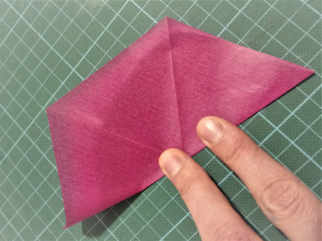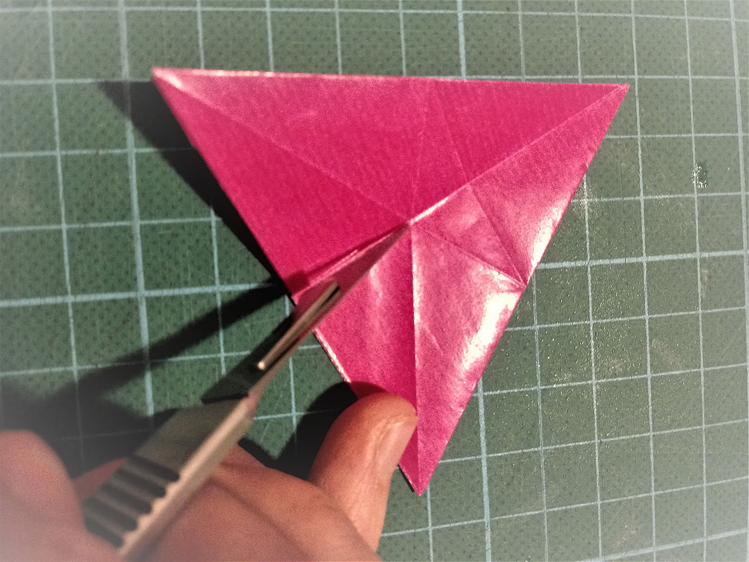 - Schneide das Dreieck oben an der Seite, die der Spitze gegenüberliegt, mittig entlang des Falzes ein. Der Schnitt endet an der Stelle, an der mehrere Falze sich treffen.