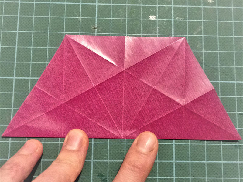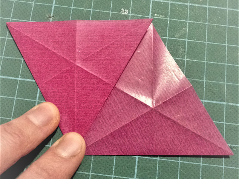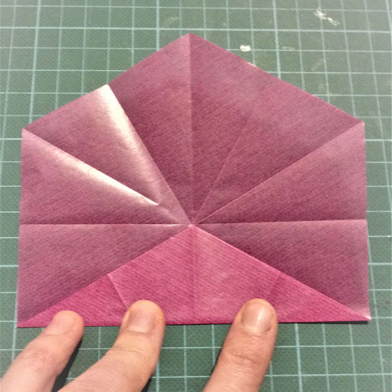 - Falte jede Ecke einmal aufeinander. Es entstehen 12 Falze.