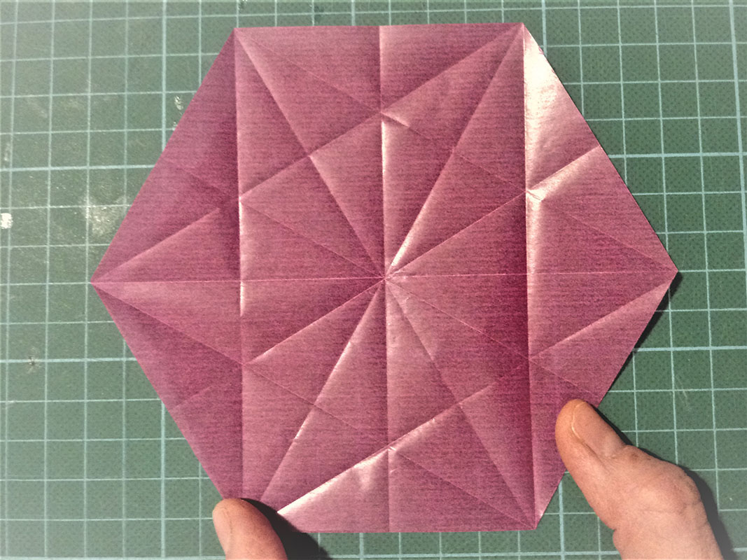 - Falte nun das Dreieck auf, so dass wieder das Sechseck vor dir liegt.