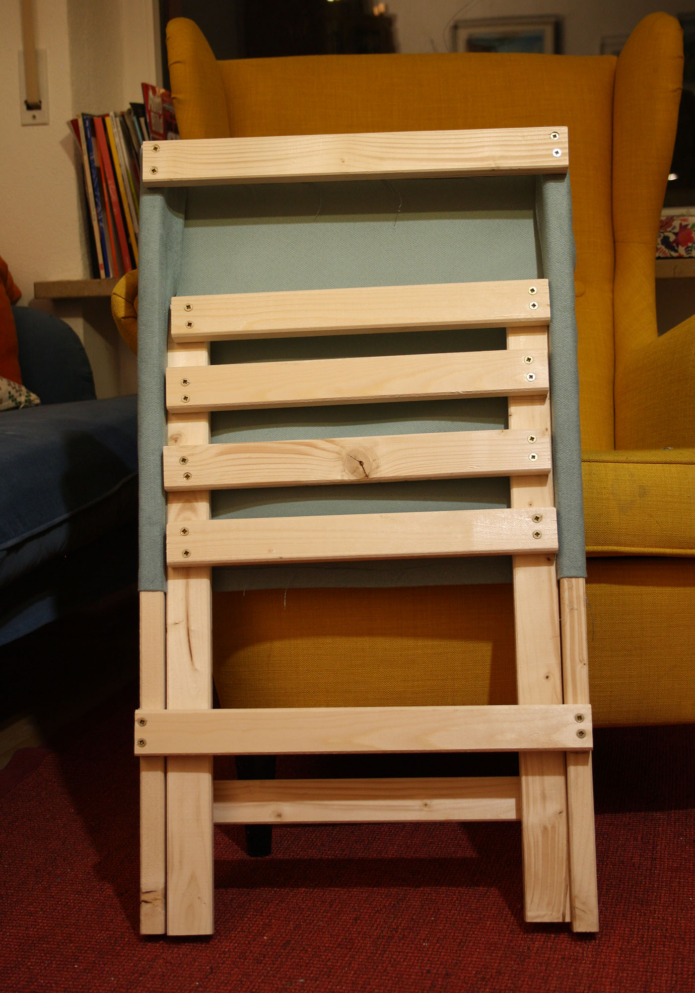 - Nun wird die letzte kurze Latte der Rückenlehne befestigt. Sie wird einfach über den Stoff bündig mit der oberen Kante an der Rückseite verschraubt. Jetzt siehst du auch, ob deine seitlichen Latte parallel gelegen haben und du kannst beim verschrauben eventuell den Stoff etwas nachspannen, in dem du leichten Zug auf die seitlichen Hölzer bringst.