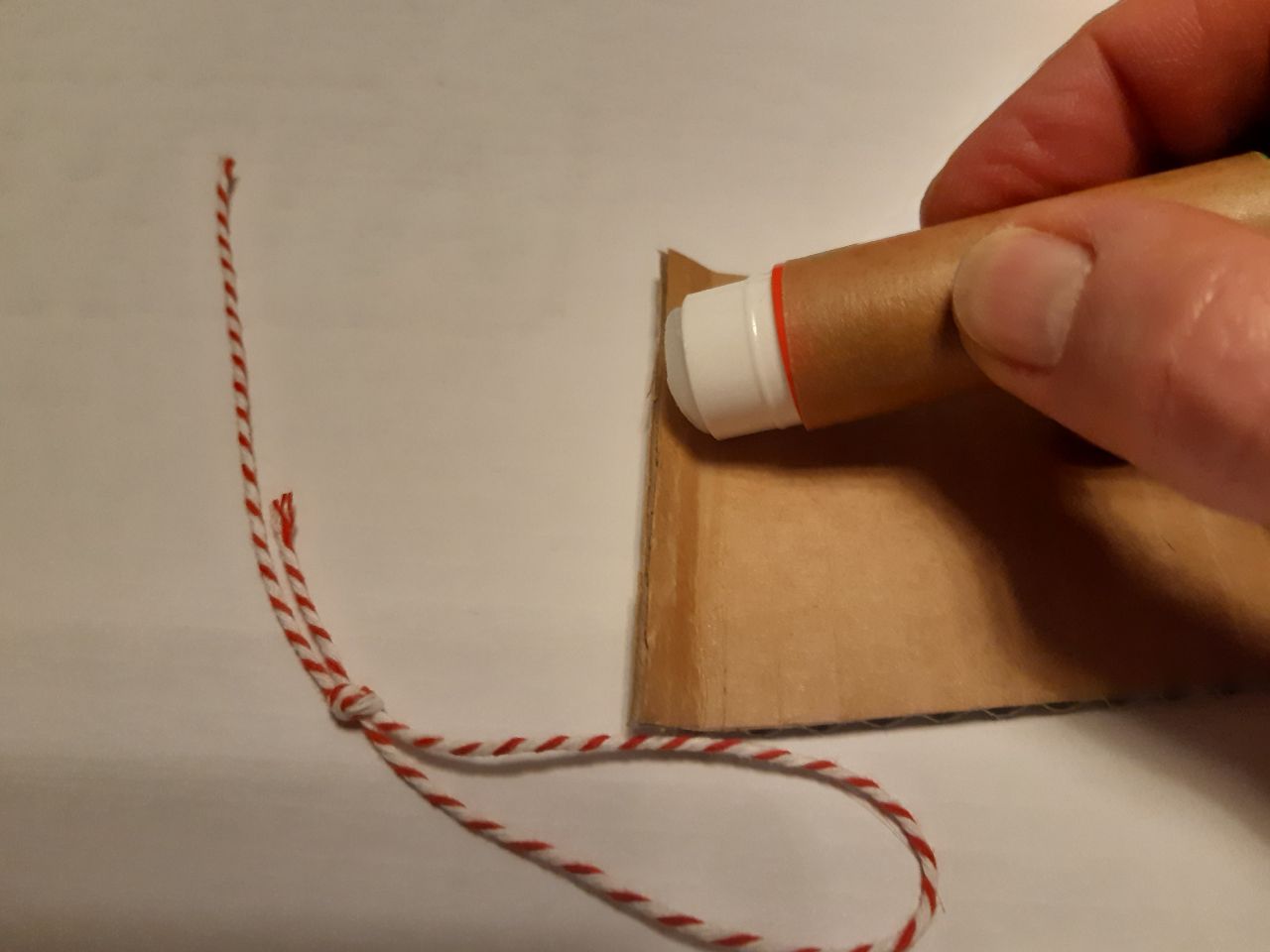 - Klebe das Bändchen mit der Schlaufe an der Seite mit dem etwas größeren Winkel, am breiten Ende des spitzen Streifens fest.