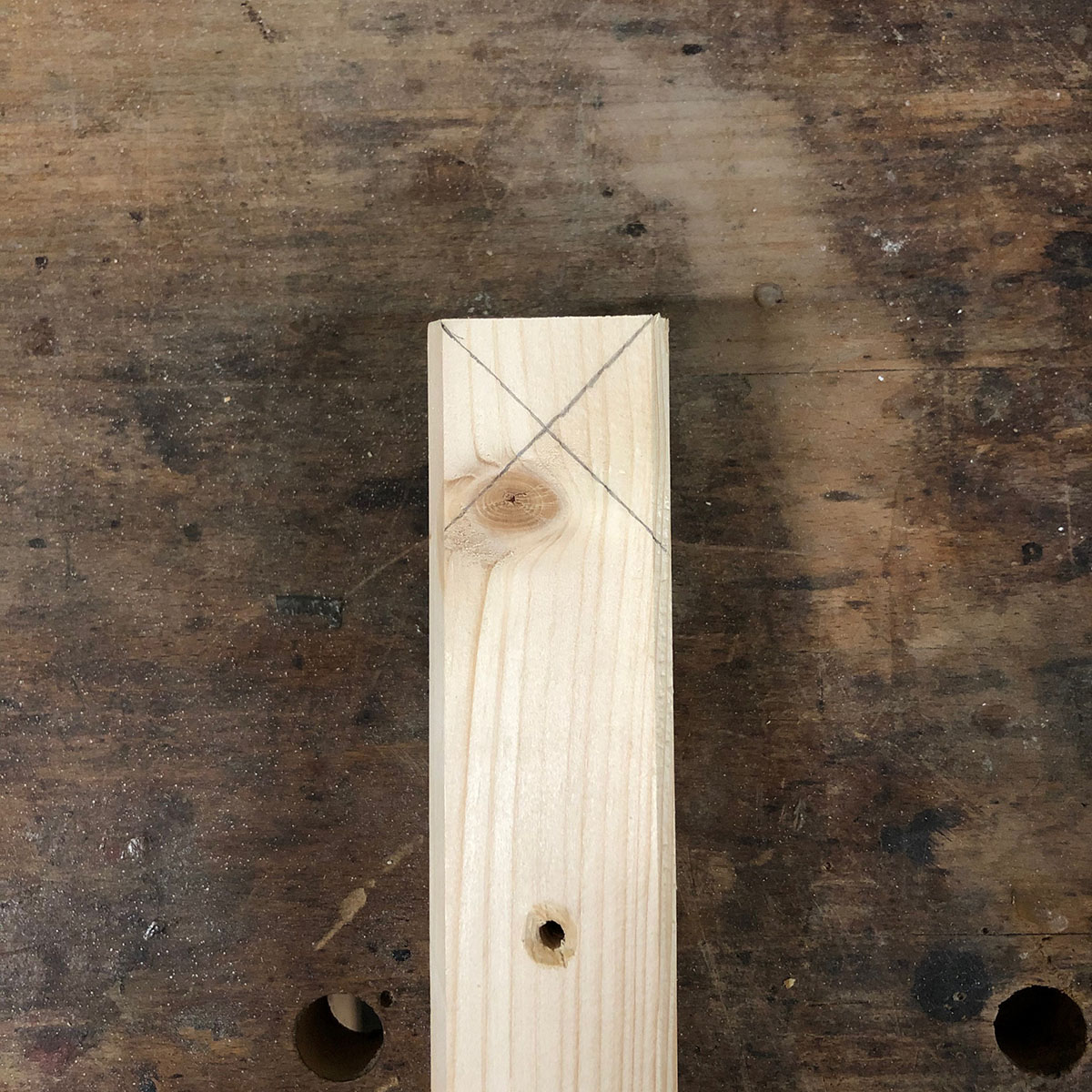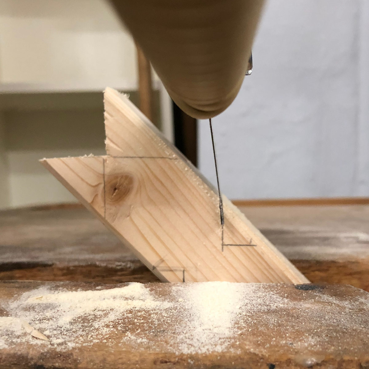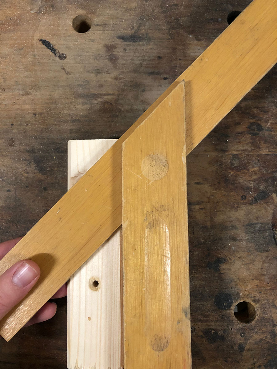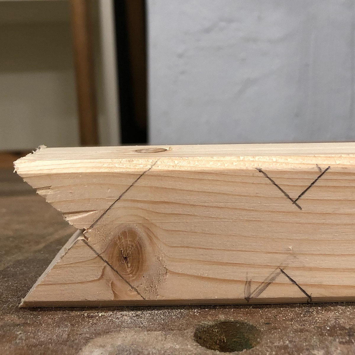 - Um die Krone noch deutlicher abzusetzen wird rundherum eine Fuge eingesägt: Hierfür zeichnest du ein Dreieck an der Seitenkante an, ebenfalls im 45º Winkel, mit 6m Abstand zur Spitze der Krone. Die Füge wird 1,5 cm breit.
